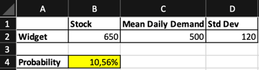 In Excel, enter the mean and standard deviation in cells C2 and D2, respectively, and enter your inventory level (650) in cell B2.