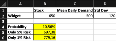 And use the formula: =NORM.INV(0,95; C2; D2) This function will give you the inventory level required to have only a 5% risk of running out. The 0.95 represents the 95th percentile, ensuring only a 5% chance of exceeding the stock.