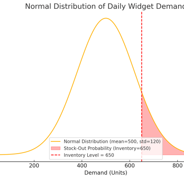 The shaded red area to the right of the inventory level of 650 represents the probability of a stock-out, indicating the chance that demand will exceed your available inventory.