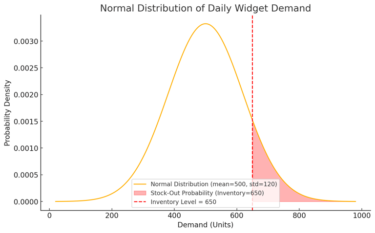 Imagine you're managing a warehouse that supplies widgets to a retailer. The daily demand for widgets is Normally distributed with a mean of 500 units and a standard deviation of 120 units.